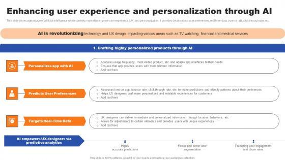 This slide showcases usage of artificial intelligence which can help marketers improve user experience UX and personalization. It provides details about user preferences, real time-data, bounce rate, click through rate, etc. There are so many reasons you need a EEnhancing User Experience And Personalization Through AI Ppt Gallery Styles Pdf. The first reason is you can not spend time making everything from scratch, Thus, Slidegeeks has made presentation templates for you too. You can easily download these templates from our website easily. This slide showcases usage of artificial intelligence which can help marketers improve user experience UX and personalization. It provides details about user preferences, real time-data, bounce rate, click through rate, etc.