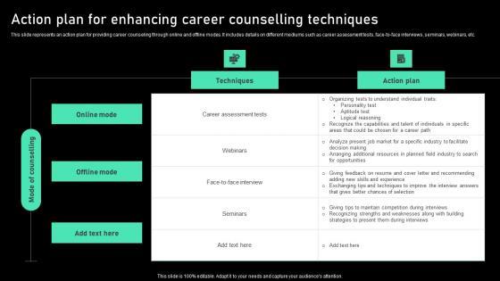 This slide represents an action plan for providing career counseling through online and offline modes. It includes details on different mediums such as career assessment tests,face-to-face interviews,seminars,webinars,etc. Pitch your topic with ease and precision using this Action Plan For Enhancing Career Counselling Techniques Download Pdf. This layout presents information on Career Assessment Tests,Seminars,Webinars. It is also available for immediate download and adjustment. So,changes can be made in the color,design,graphics or any other component to create a unique layout. This slide represents an action plan for providing career counseling through online and offline modes. It includes details on different mediums such as career assessment tests, face-to-face interviews, seminars, webinars, etc.