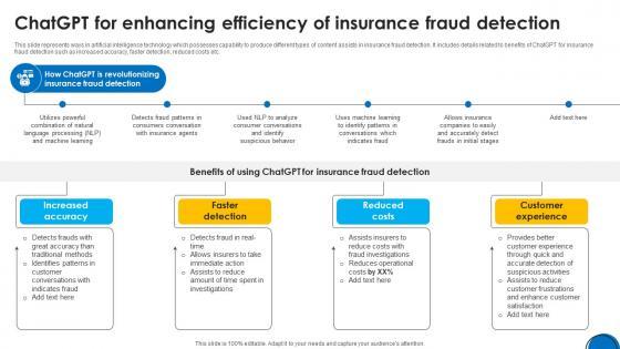 This slide represents ways in artificial intelligence technology which possesses capability to produce different types of content assists in insurance fraud detection. It includes details related to benefits of ChatGPT for insurance fraud detection such as increased accuracy, faster detection, reduced costs etc. Do you have an important presentation coming up Are you looking for something that will make your presentation stand out from the rest Look no further than Implementing ChatGpt In Insurance ChatGpt For Enhancing Efficiency Of Insurance ChatGpt SS V. With our professional designs, you can trust that your presentation will pop and make delivering it a smooth process. And with Slidegeeks, you can trust that your presentation will be unique and memorable. So why wait Grab Implementing ChatGpt In Insurance ChatGpt For Enhancing Efficiency Of Insurance ChatGpt SS V today and make your presentation stand out from the rest This slide represents ways in artificial intelligence technology which possesses capability to produce different types of content assists in insurance fraud detection. It includes details related to benefits of ChatGPT for insurance fraud detection such as increased accuracy, faster detection, reduced costs etc.