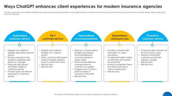 This slide represents ways in artificial intelligence technology which possesses capability to produce different types of content helps to enhance customer experiences in insurance sector. It includes details related to automated customer service etc. Retrieve professionally designed Implementing ChatGpt In Insurance Ways ChatGpt Enhances Client Experiences ChatGpt SS V to effectively convey your message and captivate your listeners. Save time by selecting pre-made slideshows that are appropriate for various topics, from business to educational purposes. These themes come in many different styles, from creative to corporate, and all of them are easily adjustable and can be edited quickly. Access them as PowerPoint templates or as Google Slides themes. You do not have to go on a hunt for the perfect presentation because Slidegeeks got you covered from everywhere. This slide represents ways in artificial intelligence technology which possesses capability to produce different types of content helps to enhance customer experiences in insurance sector. It includes details related to automated customer service etc.