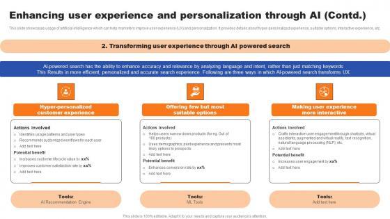 This slide showcases usage of artificial intelligence which can help marketers improve user experience UX and personalization. It provides details about user preferences, real time-data, bounce rate, click through rate, etc. There are so many reasons you need a EEnhancing User Experience And Personalization Through AI Ppt Gallery Styles Pdf. The first reason is you can not spend time making everything from scratch, Thus, Slidegeeks has made presentation templates for you too. You can easily download these templates from our website easily. This slide showcases usage of artificial intelligence which can help marketers improve user experience UX and personalization. It provides details about user preferences, real time-data, bounce rate, click through rate, etc.