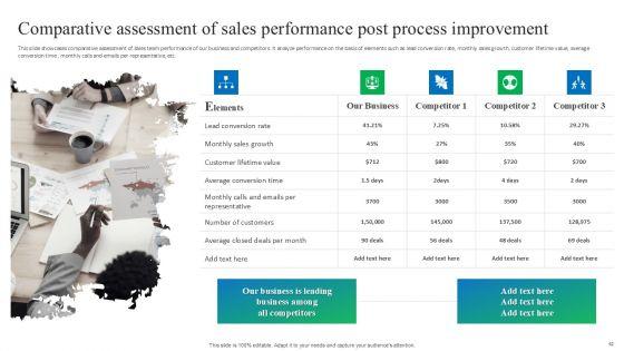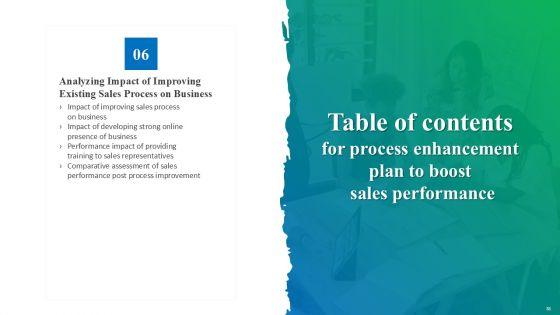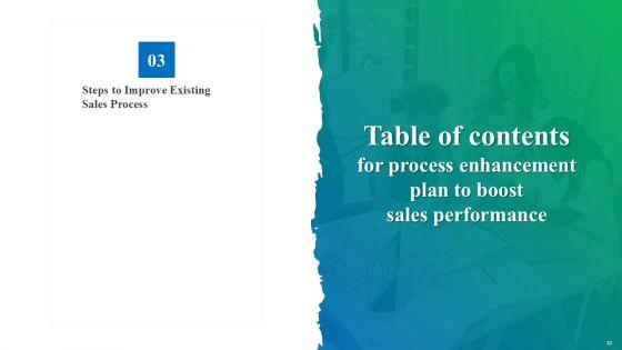 Most businesses are transaction based and require you to sell. This Process Enhancement Plan To Boost Sales Performance Ppt PowerPoint Presentation Complete Deck With Slides helps you master all areas that go into ensuring business success. The comprehensive deck of fifty eight slides is a primer on major business areas. Use this PPT template to make sure you can speak on domains like planning innovation funding and staffing with and flair. The professionally designs slides exhibit your hands-on expertise to an audience, which can be turned into clients or stakeholders with the use of this presentation template. The 100 percent editable nature of the presentation makes it that much more easy to do this. Download now to make sure you always stay current and updated, and our slides provide you with this ability.