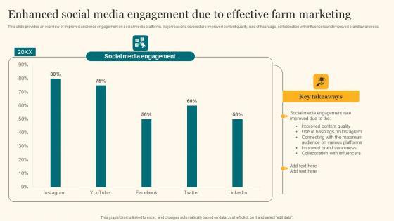 This slide provides an overview of improved audience engagement on social media platforms. Major reasons covered are improved content quality, use of hashtags, collaboration with influencers and improved brand awareness. Make sure to capture your audiences attention in your business displays with our gratis customizable Agriculture Marketing Strategy To Improve Revenue Performance Enhanced Social Media Engagement Due Effective Microsoft PDF. These are great for business strategies, office conferences, capital raising or task suggestions. If you desire to acquire more customers for your tech business and ensure they stay satisfied, create your own sales presentation with these plain slides.