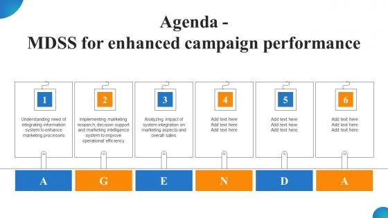 Find a pre-designed and impeccable Agenda MDSS For Enhanced Campaign Performance Demonstration Pdf The templates can ace your presentation without additional effort. You can download these easy-to-edit presentation templates to make your presentation stand out from others. So, what are you waiting for Download the template from Slidegeeks today and give a unique touch to your presentation. Our Agenda MDSS For Enhanced Campaign Performance Demonstration Pdf are topically designed to provide an attractive backdrop to any subject. Use them to look like a presentation pro.
