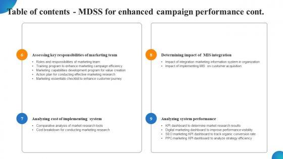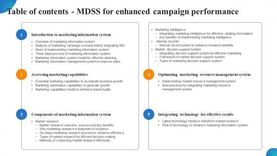 Explore a selection of the finest MDSS For Enhanced Campaign Performance Table Of Contents Demonstration Pdf here. With a plethora of professionally designed and pre-made slide templates, you can quickly and easily find the right one for your upcoming presentation. You can use our MDSS For Enhanced Campaign Performance Table Of Contents Demonstration Pdf to effectively convey your message to a wider audience. Slidegeeks has done a lot of research before preparing these presentation templates. The content can be personalized and the slides are highly editable. Grab templates today from Slidegeeks. Our MDSS For Enhanced Campaign Performance Table Of Contents Demonstration Pdf are topically designed to provide an attractive backdrop to any subject. Use them to look like a presentation pro.