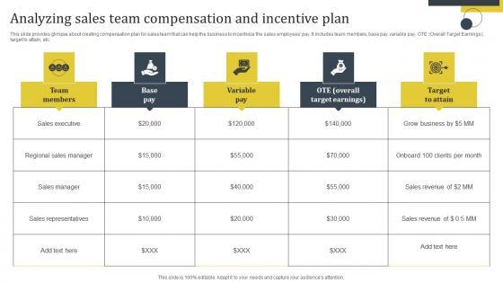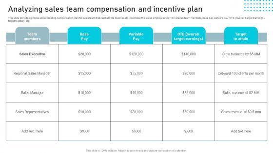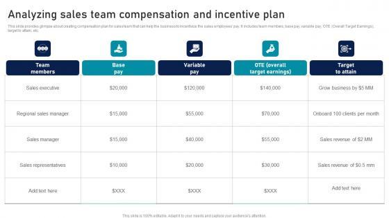 This slide provides glimpse about creating compensation plan for sales team that can help the business to incentivize the sales employees pay. It includes team members, base pay, variable pay, OTE Overall Target Earnings , target to attain, etc. Want to ace your presentation in front of a live audience Our Analyzing Sales Team Effective Sales Strategy To Enhance Customer Retention Icons Pdf can help you do that by engaging all the users towards you. Slidegeeks experts have put their efforts and expertise into creating these impeccable powerpoint presentations so that you can communicate your ideas clearly. Moreover, all the templates are customizable, and easy to edit and downloadable. Use these for both personal and commercial use. This slide provides glimpse about creating compensation plan for sales team that can help the business to incentivize the sales employees pay. It includes team members, base pay, variable pay, OTE Overall Target Earnings , target to attain, etc.