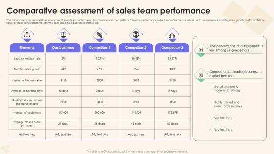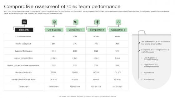 This slide showcases comparative assessment of sales team performance of our business and competitors. It analyze performance on the basis of elements such as lead conversion rate, monthly sales growth, customer lifetime value, average conversion time, monthly calls and emails per representative, etc. Get a simple yet stunning designed Comparative Assessment Of Sales Team Sales Performance Enhancement Sample Pdf. It is the best one to establish the tone in your meetings. It is an excellent way to make your presentations highly effective. So, download this PPT today from Slidegeeks and see the positive impacts. Our easy to edit Comparative Assessment Of Sales Team Sales Performance Enhancement Sample Pdf can be your go to option for all upcoming conferences and meetings. So, what are you waiting for Grab this template today. This slide showcases comparative assessment of sales team performance of our business and competitors. It analyze performance on the basis of elements such as lead conversion rate, monthly sales growth, customer lifetime value, average conversion time, monthly calls and emails per representative, etc.