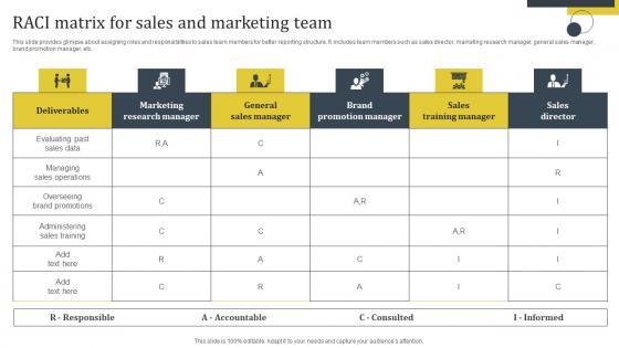 This slide provides glimpse about assigning roles and responsibilities to sales team members for better reporting structure. It includes team members such as sales director, marketing research manager, general sales manager, brand promotion manager, etc. Retrieve professionally designed RACI Matrix For Sales And Marketing Team Strategic Sales Plan To Enhance Slides Pdf to effectively convey your message and captivate your listeners. Save time by selecting pre-made slideshows that are appropriate for various topics, from business to educational purposes. These themes come in many different styles, from creative to corporate, and all of them are easily adjustable and can be edited quickly. Access them as PowerPoint templates or as Google Slides themes. You do not have to go on a hunt for the perfect presentation because Slidegeeks got you covered from everywhere. This slide provides glimpse about assigning roles and responsibilities to sales team members for better reporting structure. It includes team members such as sales director, marketing research manager, general sales manager, brand promotion manager, etc.