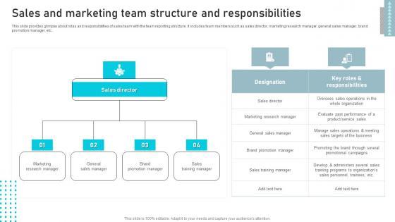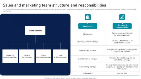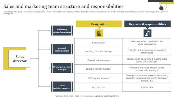 This slide provides glimpse about roles and responsibilities of sales team with the team reporting structure. It includes team members such as sales director, marketing research manager, general sales manager, brand promotion manager, etc. Here you can discover an assortment of the finest PowerPoint and Google Slides templates. With these templates, you can create presentations for a variety of purposes while simultaneously providing your audience with an eye catching visual experience. Download Sales And Marketing Team Effective Sales Strategy To Enhance Customer Retention Slides Pdf to deliver an impeccable presentation. These templates will make your job of preparing presentations much quicker, yet still, maintain a high level of quality. Slidegeeks has experienced researchers who prepare these templates and write high quality content for you. Later on, you can personalize the content by editing the Sales And Marketing Team Effective Sales Strategy To Enhance Customer Retention Slides Pdf. This slide provides glimpse about roles and responsibilities of sales team with the team reporting structure. It includes team members such as sales director, marketing research manager, general sales manager, brand promotion manager, etc.
