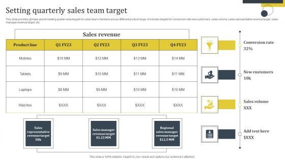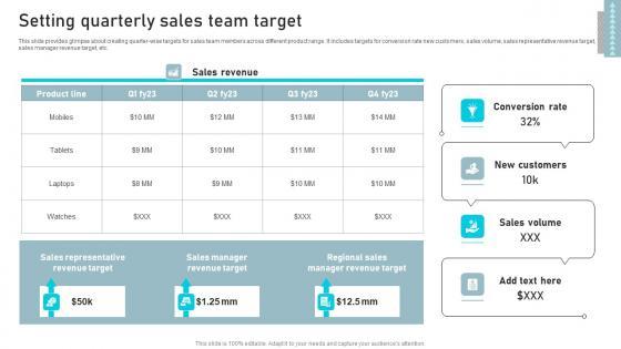 This slide provides glimpse about creating quarter-wise targets for sales team members across different product range. It includes targets for conversion rate new customers, sales volume, sales representative revenue target, sales manager revenue target, etc. Take your projects to the next level with our ultimate collection of Setting Quarterly Sales Team Target Strategic Sales Plan To Enhance Portrait Pdf. Slidegeeks has designed a range of layouts that are perfect for representing task or activity duration, keeping track of all your deadlines at a glance. Tailor these designs to your exact needs and give them a truly corporate look with your own brand colors they well make your projects stand out from the rest. This slide provides glimpse about creating quarter-wise targets for sales team members across different product range. It includes targets for conversion rate new customers, sales volume, sales representative revenue target, sales manager revenue target, etc.
