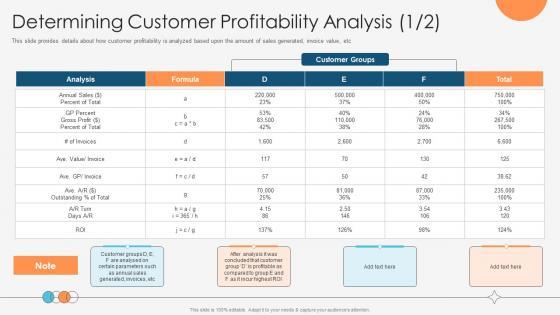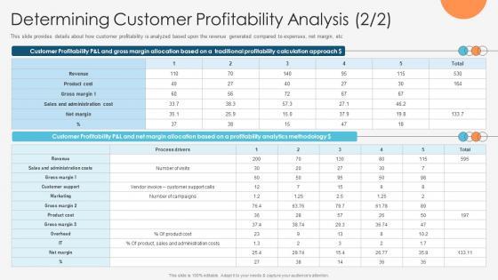 This slide provides details about how customer profitability is analyzed based upon the amount of sales generated, invoice value, etc. Slidegeeks is here to make your presentations a breeze with Enhancing Profitability Modelling Determining Customer Profitability Analysis With our easy-to-use and customizable templates, you can focus on delivering your ideas rather than worrying about formatting. With a variety of designs to choose from, you are sure to find one that suits your needs. And with animations and unique photos, illustrations, and fonts, you can make your presentation pop. So whether you are giving a sales pitch or presenting to the board, make sure to check out Slidegeeks first This slide provides details about how customer profitability is analyzed based upon the amount of sales generated, invoice value, etc