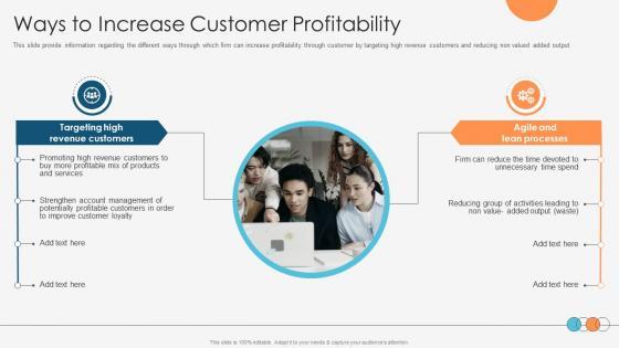This slide provide information regarding the different ways through which firm can increase profitability through customer by targeting high revenue customers and reducing non valued added output. Coming up with a presentation necessitates that the majority of the effort goes into the content and the message you intend to convey. The visuals of a PowerPoint presentation can only be effective if it supplements and supports the story that is being told. Keeping this in mind our experts created Enhancing Profitability Modelling Ways To Increase Customer Profitability to reduce the time that goes into designing the presentation. This way, you can concentrate on the message while our designers take care of providing you with the right template for the situation. This slide provide information regarding the different ways through which firm can increase profitability through customer by targeting high revenue customers and reducing non valued added output