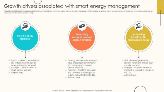 This slide highlights global trends associated with energy management and the integration of smart devices. It includes growth drivers such as a rise in energy demand, increasing awareness about carbon emissions, and increasing investment in renewable energy. Slidegeeks is here to make your presentations a breeze with Growth Drivers Associated With Internet Of Things Solutions To Enhance Energy IoT SS V With our easy-to-use and customizable templates, you can focus on delivering your ideas rather than worrying about formatting. With a variety of designs to choose from, you are sure to find one that suits your needs. And with animations and unique photos, illustrations, and fonts, you can make your presentation pop. So whether you are giving a sales pitch or presenting to the board, make sure to check out Slidegeeks first This slide highlights global trends associated with energy management and the integration of smart devices. It includes growth drivers such as a rise in energy demand, increasing awareness about carbon emissions, and increasing investment in renewable energy.