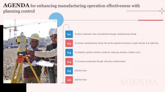 Boost your pitch with our creative Agenda Manufacturing Operations Management Process Enhancement Strategies Infographics PDF. Deliver an awe inspiring pitch that will mesmerize everyone. Using these presentation templates you will surely catch everyones attention. You can browse the ppts collection on our website. We have researchers who are experts at creating the right content for the templates. So you do not have to invest time in any additional work. Just grab the template now and use them.