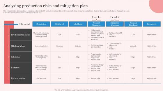 This slide provides glimpse about developing a plan to identify production risks and control measures that can help an organization to check and ensure manufacturing of a quality product. It includes hazard, description, risk level, likelihood, etc. Boost your pitch with our creative Analyzing Production Enhancing Manufacturing Operation Effectiveness Template Pdf. Deliver an awe inspiring pitch that will mesmerize everyone. Using these presentation templates you will surely catch everyones attention. You can browse the ppts collection on our website. We have researchers who are experts at creating the right content for the templates. So you do not have to invest time in any additional work. Just grab the template now and use them. This slide provides glimpse about developing a plan to identify production risks and control measures that can help an organization to check and ensure manufacturing of a quality product. It includes hazard, description, risk level, likelihood, etc.