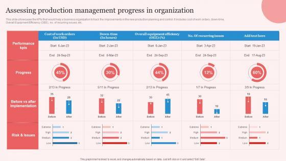 This slide showcases the KPIs that would help a business organization to track the improvements in the new production planning and control. It includes cost of work orders, down time, Overall Equipment Efficiency OEE, no. of recurring issues, etc. Create an editable Assessing Production Enhancing Manufacturing Operation Effectiveness Slides Pdf that communicates your idea and engages your audience. Whether you are presenting a business or an educational presentation, pre designed presentation templates help save time. Assessing Production Enhancing Manufacturing Operation Effectiveness Slides Pdf is highly customizable and very easy to edit, covering many different styles from creative to business presentations. Slidegeeks has creative team members who have crafted amazing templates. So, go and get them without any delay. This slide showcases the KPIs that would help a business organization to track the improvements in the new production planning and control. It includes cost of work orders, down time, Overall Equipment Efficiency OEE, no. of recurring issues, etc.