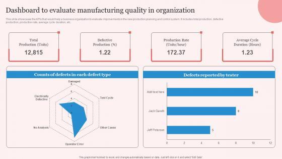 This slide showcases the KPIs that would help a business organization to evaluate improvements in the new production planning and control system. It includes total production, defective production, production rate, average cycle duration, etc. Do you have to make sure that everyone on your team knows about any specific topic I yes, then you should give Dashboard To Enhancing Manufacturing Operation Effectiveness Professional Pdf a try. Our experts have put a lot of knowledge and effort into creating this impeccable Dashboard To Enhancing Manufacturing Operation Effectiveness Professional Pdf. You can use this template for your upcoming presentations, as the slides are perfect to represent even the tiniest detail. You can download these templates from the Slidegeeks website and these are easy to edit. So grab these today. This slide showcases the KPIs that would help a business organization to evaluate improvements in the new production planning and control system. It includes total production, defective production, production rate, average cycle duration, etc.
