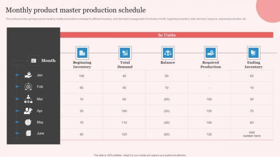This slide provides glimpse about creating master production schedule for efficient inventory and demand management. It includes month, beginning inventory, total demand, balance, required production, etc. Are you in need of a template that can accommodate all of your creative concepts This one is crafted professionally and can be altered to fit any style. Use it with Google Slides or PowerPoint. Include striking photographs, symbols, depictions, and other visuals. Fill, move around, or remove text boxes as desired. Test out color palettes and font mixtures. Edit and save your work, or work with colleagues. Download Monthly Product Master Enhancing Manufacturing Operation Effectiveness Information Pdf and observe how to make your presentation outstanding. Give an impeccable presentation to your group and make your presentation unforgettable. This slide provides glimpse about creating master production schedule for efficient inventory and demand management. It includes month, beginning inventory, total demand, balance, required production, etc.