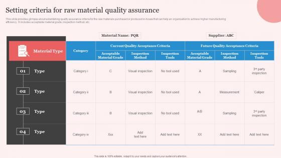 This slide provides glimpse about establishing quality assurance criteria for the raw materials purchased or produced in house that can help an organization to achieve higher manufacturing efficiency. It includes acceptable material grade, inspection method, etc. Welcome to our selection of the Setting Criteria For Raw Enhancing Manufacturing Operation Effectiveness Designs Pdf. These are designed to help you showcase your creativity and bring your sphere to life. Planning and Innovation are essential for any business that is just starting out. This collection contains the designs that you need for your everyday presentations. All of our PowerPoints are 100 percent editable, so you can customize them to suit your needs. This multi purpose template can be used in various situations. Grab these presentation templates today. This slide provides glimpse about establishing quality assurance criteria for the raw materials purchased or produced in house that can help an organization to achieve higher manufacturing efficiency. It includes acceptable material grade, inspection method, etc.
