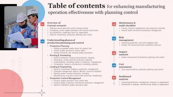 From laying roadmaps to briefing everything in detail, our templates are perfect for you. You can set the stage with your presentation slides. All you have to do is download these easy to edit and customizable templates. Enhancing Manufacturing Operation Effectiveness Table Of Contents Inspiration Pdf will help you deliver an outstanding performance that everyone would remember and praise you for. Do download this presentation today. Our Enhancing Manufacturing Operation Effectiveness Table Of Contents Inspiration Pdf are topically designed to provide an attractive backdrop to any subject. Use them to look like a presentation pro.
