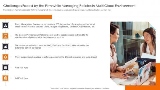 This slide covers the challenges faced by the firm in managing multi cloud policies such as access, security, quota, budget, regulations, utilizations and many more Are you in need of a template that can accommodate all of your creative concepts This one is crafted professionally and can be altered to fit any style. Use it with Google Slides or PowerPoint. Include striking photographs, symbols, depictions, and other visuals. Fill, move around, or remove text boxes as desired. Test out color palettes and font mixtures. Edit and save your work, or work with colleagues. Download Challenges Faced By The Firm Enhancing Workload Efficiency Through Cloud Architecture Introduction Pdf and observe how to make your presentation outstanding. Give an impeccable presentation to your group and make your presentation unforgettable. This slide covers the challenges faced by the firm in managing multi cloud policies such as access, security, quota, budget, regulations, utilizations and many more