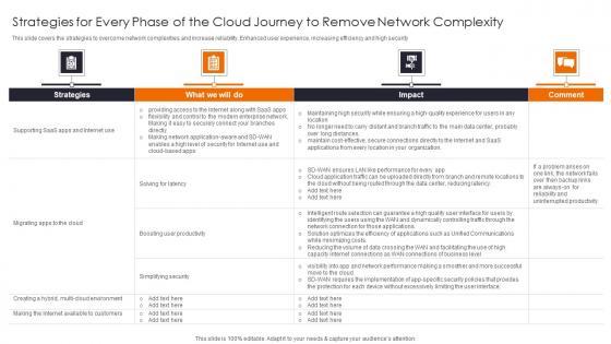 This slide covers the strategies to overcome network complexities and increase reliability, Enhanced user experience, increasing efficiency and high security Slidegeeks is here to make your presentations a breeze with Strategies For Every Phase Enhancing Workload Efficiency Through Cloud Architecture Ideas Pdf With our easy to use and customizable templates, you can focus on delivering your ideas rather than worrying about formatting. With a variety of designs to choose from, you are sure to find one that suits your needs. And with animations and unique photos, illustrations, and fonts, you can make your presentation pop. So whether you are giving a sales pitch or presenting to the board, make sure to check out Slidegeeks first This slide covers the strategies to overcome network complexities and increase reliability, Enhanced user experience, increasing efficiency and high security