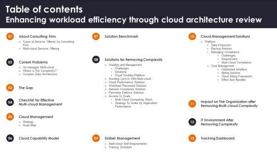 Find highly impressive Table Of Contents Enhancing Workload Efficiency Through Cloud Architecture Review Sample Pdf on Slidegeeks to deliver a meaningful presentation. You can save an ample amount of time using these presentation templates. No need to worry to prepare everything from scratch because Slidegeeks experts have already done a huge research and work for you. You need to download Table Of Contents Enhancing Workload Efficiency Through Cloud Architecture Review Sample Pdf for your upcoming presentation. All the presentation templates are 100 percent editable and you can change the color and personalize the content accordingly. Download now Our Table Of Contents Enhancing Workload Efficiency Through Cloud Architecture Review Sample Pdf are topically designed to provide an attractive backdrop to any subject. Use them to look like a presentation pro.