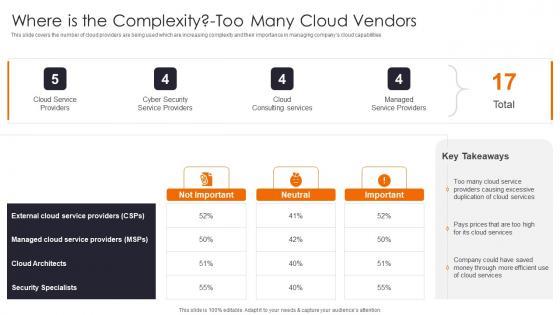This slide covers the number of cloud providers are being used which are increasing complexity and their importance in managing companys cloud capabilities Make sure to capture your audiences attention in your business displays with our gratis customizable Where Is The Complexity Enhancing Workload Efficiency Through Cloud Architecture Icons Pdf. These are great for business strategies, office conferences, capital raising or task suggestions. If you desire to acquire more customers for your tech business and ensure they stay satisfied, create your own sales presentation with these plain slides. This slide covers the number of cloud providers are being used which are increasing complexity and their importance in managing companys cloud capabilities