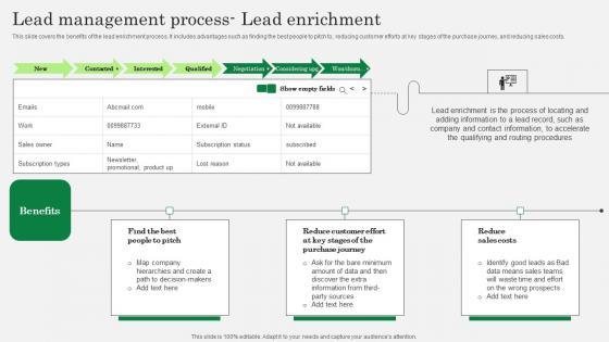 This slide covers the benefits of the lead enrichment process. It includes advantages such as finding the best people to pitch to, reducing customer efforts at key stages of the purchase journey, and reducing sales costs. Present like a pro with Lead Management Process Lead Enrichment Improving Lead Generation Process Designs PDF Create beautiful presentations together with your team, using our easy to use presentation slides. Share your ideas in real time and make changes on the fly by downloading our templates. So whether you are in the office, on the go, or in a remote location, you can stay in sync with your team and present your ideas with confidence. With Slidegeeks presentation got a whole lot easier. Grab these presentations today.