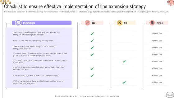 The following slide showcases assessment checklist which can help marketers to ensure effective deployment of line extension strategy. It provides details about features, product development, self service portal, product diversity, funding, etc. Get a simple yet stunning designed Checklist To Ensure Effective Implementation Of Line Extension Strategy Themes PDF. It is the best one to establish the tone in your meetings. It is an excellent way to make your presentations highly effective. So, download this PPT today from Slidegeeks and see the positive impacts. Our easy-to-edit Checklist To Ensure Effective Implementation Of Line Extension Strategy Themes PDF can be your go-to option for all upcoming conferences and meetings. So, what are you waiting for Grab this template today.