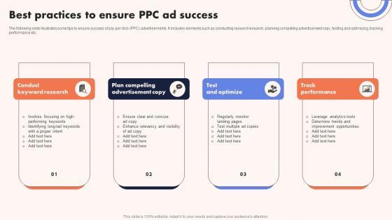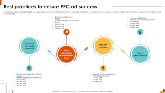 The following slide illustrates some tips to ensure success of pay per click PPC advertisements. It includes elements such as conducting keyword research, planning compelling advertisement copy, testing and optimizing, tracking performance etc. Do you have an important presentation coming up Are you looking for something that will make your presentation stand out from the rest Look no further than Best Practices To Ensure PPC Ad Success Running Marketing Campaigns Strategy SS V. With our professional designs, you can trust that your presentation will pop and make delivering it a smooth process. And with Slidegeeks, you can trust that your presentation will be unique and memorable. So why wait Grab Best Practices To Ensure PPC Ad Success Running Marketing Campaigns Strategy SS V today and make your presentation stand out from the rest The following slide illustrates some tips to ensure success of pay per click PPC advertisements. It includes elements such as conducting keyword research, planning compelling advertisement copy, testing and optimizing, tracking performance etc.