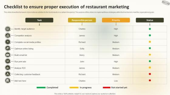This slide shows the framework of promotional activities for the food industry in a certain time period. The purpose of this slide is to implement these strategies within the time frame to meet the organizational goals. There are so many reasons you need a Checklist To Ensure Proper Execution Of Restaurant Marketing Create An Effective Restaurant. The first reason is you can not spend time making everything from scratch, Thus, Slidegeeks has made presentation templates for you too. You can easily download these templates from our website easily. This slide shows the framework of promotional activities for the food industry in a certain time period. The purpose of this slide is to implement these strategies within the time frame to meet the organizational goals.