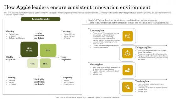 This slide provides information regarding Apple leaders who are capable in managing consistent innovation by leadership model. Leader segregates tasks in different segments such as owning, learning, etc. based on involvement in details and expertise extent. The How Apple Leaders Ensure Apple Branding Strategy To Become Market Leader Inspiration Pdf is a compilation of the most recent design trends as a series of slides. It is suitable for any subject or industry presentation, containing attractive visuals and photo spots for businesses to clearly express their messages. This template contains a variety of slides for the user to input data, such as structures to contrast two elements, bullet points, and slides for written information. Slidegeeks is prepared to create an impression. This slide provides information regarding Apple leaders who are capable in managing consistent innovation by leadership model. Leader segregates tasks in different segments such as owning, learning, etc. based on involvement in details and expertise extent.