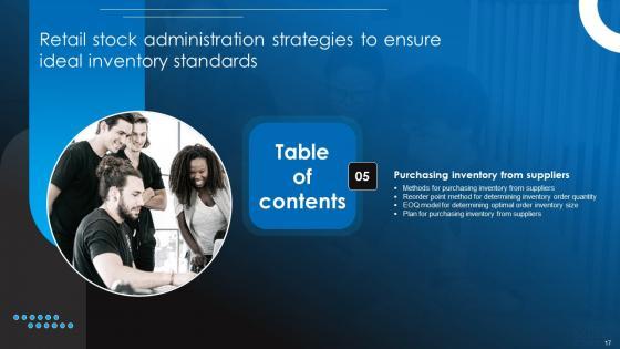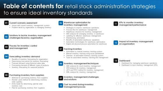 From laying roadmaps to briefing everything in detail, our templates are perfect for you. You can set the stage with your presentation slides. All you have to do is download these easy-to-edit and customizable templates. Retail Stock Administration Strategies Ensure Ideal Inventory Standards Table Of Contents Topic Pdf will help you deliver an outstanding performance that everyone would remember and praise you for. Do download this presentation today. Our Retail Stock Administration Strategies Ensure Ideal Inventory Standards Table Of Contents Topic Pdf are topically designed to provide an attractive backdrop to any subject. Use them to look like a presentation pro.