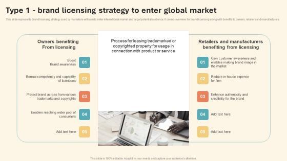 This slide represents brand licensing strategy used by marketers with aim to enter international market and target potential audience. It covers overview for brand licensing along with benefits to owners, retailers and manufacturers.From laying roadmaps to briefing everything in detail, our templates are perfect for you. You can set the stage with your presentation slides. All you have to do is download these easy-to-edit and customizable templates. Type 1 Brand Licensing Strategy To Enter Global International Marketing Strategy Information Pdf will help you deliver an outstanding performance that everyone would remember and praise you for. Do download this presentation today. This slide represents brand licensing strategy used by marketers with aim to enter international market and target potential audience. It covers overview for brand licensing along with benefits to owners, retailers and manufacturers.