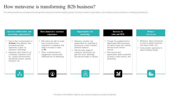 This slide represents ways and approaches through which metaverse is transforming B2b business. It includes increase in collaborations, more immersive customer experience, marketing opportunities etc. Get a simple yet stunning designed Strategic Ecommerce Plan For B2B Enterprises How Metaverse Is Transforming B2b Business Sample PDF. It is the best one to establish the tone in your meetings. It is an excellent way to make your presentations highly effective. So, download this PPT today from Slidegeeks and see the positive impacts. Our easy-to-edit Strategic Ecommerce Plan For B2B Enterprises How Metaverse Is Transforming B2b Business Sample PDF can be your go-to option for all upcoming conferences and meetings. So, what are you waiting for Grab this template today.