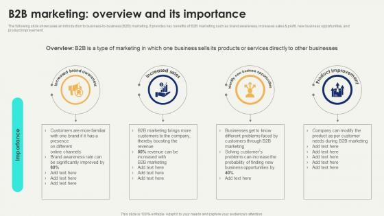 The following slide showcases an introduction to business to business B2B marketing. It provides key benefits of B2B marketing such as brand awareness, increases sales and profit, new business opportunities, and product improvement. Present like a pro with B2B Marketing Overview Digital Marketing Strategies To Improve Enterprise Sales Slides Pdf Create beautiful presentations together with your team, using our easy to use presentation slides. Share your ideas in real time and make changes on the fly by downloading our templates. So whether you are in the office, on the go, or in a remote location, you can stay in sync with your team and present your ideas with confidence. With Slidegeeks presentation got a whole lot easier. Grab these presentations today. The following slide showcases an introduction to business to business B2B marketing. It provides key benefits of B2B marketing such as brand awareness, increases sales and profit, new business opportunities, and product improvement.
