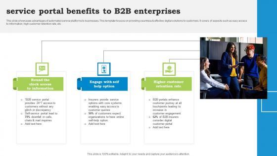 This slide showcases advantages of automated service platforms to businesses. This template focuses on providing seamless and effective digital solutions to customers. It covers of aspects such as easy access to information, high customer retention rate, etc. Showcasing this set of slides titled Service Portal Benefits To B2B Enterprises Formats Pdf. The topics addressed in these templates are clock access, help option, retention rate. All the content presented in this PPT design is completely editable. Download it and make adjustments in color, background, font etc. as per your unique business setting. This slide showcases advantages of automated service platforms to businesses. This template focuses on providing seamless and effective digital solutions to customers. It covers of aspects such as easy access to information, high customer retention rate, etc.