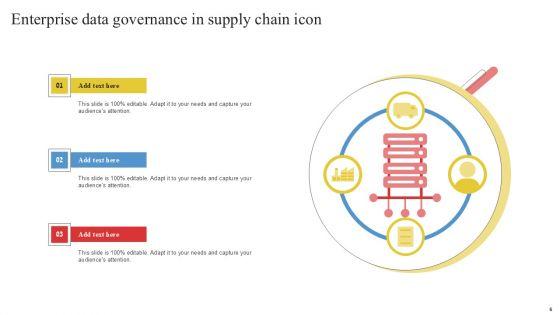 Pitch your topic with ease and precision using this Enterprise Data Governance In Supply Chain Icon Designs PDF. This layout presents information on Enterprise Data Governance, Supply Chain Icon. It is also available for immediate download and adjustment. So, changes can be made in the color, design, graphics or any other component to create a unique layout.