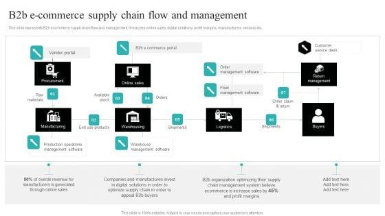 This slide represents B2b ecommerce supply chain flow and management. It includes online sales, digital solutions, profit margins, manufacturers, vendors etc. This Strategic Ecommerce Plan For B2B Enterprises B2b E Commerce Supply Chain Flow And Management Information PDF is perfect for any presentation, be it in front of clients or colleagues. It is a versatile and stylish solution for organizing your meetings. The Strategic Ecommerce Plan For B2B Enterprises B2b E Commerce Supply Chain Flow And Management Information PDF features a modern design for your presentation meetings. The adjustable and customizable slides provide unlimited possibilities for acing up your presentation. Slidegeeks has done all the homework before launching the product for you. So, do not wait, grab the presentation templates today