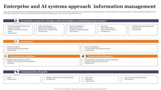 The slide showcases enterprise and artificial intelligence systems approach information that assists companies in managing their resources efficiently. The slide contains essential key points for strategic artificial intelligence and information governance. Focus areas, infrastructure and data talent and development, and communication channels Showcasing this set of slides titled Enterprise And Ai Systems Approach Information Management Sample Pdf The topics addressed in these templates are Infrastructure And Data, Talent And Development, Communication All the content presented in this PPT design is completely editable. Download it and make adjustments in color, background, font etc. as per your unique business setting. The slide showcases enterprise and artificial intelligence systems approach information that assists companies in managing their resources efficiently. The slide contains essential key points for strategic artificial intelligence and information governance. Focus areas, infrastructure and data talent and development, and communication channels