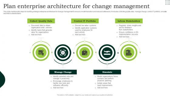 This slide mentions the steps for building strategic enterprise architecture for change management to ensure smooth transition and reduced bottlenecks. It includes collecting quality data, manage change, control IT portfolio, simulate and inform stakeholders. Pitch your topic with ease and precision using this Plan Enterprise Architecture For Change Management Information Pdf. This layout presents information on Collect Quality Data, Control It Portfolio, Inform Stakeholders. It is also available for immediate download and adjustment. So, changes can be made in the color, design, graphics or any other component to create a unique layout. This slide mentions the steps for building strategic enterprise architecture for change management to ensure smooth transition and reduced bottlenecks. It includes collecting quality data, manage change, control IT portfolio, simulate and inform stakeholders.
