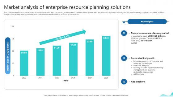 This slide presents the market size growth analysis of enterprise resource planning solutions with compound annual growth rate. It also mentions key factors behind growth such as increasing adoption of innovation, real-time analytics, and growing need for supplier-relationship management and customer relationship management.This modern and well-arranged Market Analysis Of Enterprise Resource Planning Solutions Erp And Digital Transformation For Maximizing DT SS V provides lots of creative possibilities. It is very simple to customize and edit with the Powerpoint Software. Just drag and drop your pictures into the shapes. All facets of this template can be edited with Powerpoint, no extra software is necessary. Add your own material, put your images in the places assigned for them, adjust the colors, and then you can show your slides to the world, with an animated slide included. This slide presents the market size growth analysis of enterprise resource planning solutions with compound annual growth rate. It also mentions key factors behind growth such as increasing adoption of innovation, real-time analytics, and growing need for supplier-relationship management and customer relationship management.
