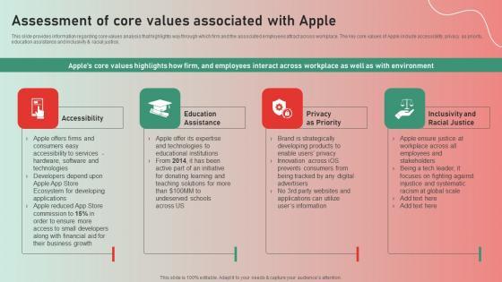This slide provides information regarding core values analysis that highlights way through which firm and the associated employees attract across workplace. The key core values of Apple include accessibility, privacy as priority, education assistance and inclusivity and racial justice. Find highly impressive Assessment Core Values Associated Apple Brand Story Journey Of Iconic Enterprise Microsoft Pdf on Slidegeeks to deliver a meaningful presentation. You can save an ample amount of time using these presentation templates. No need to worry to prepare everything from scratch because Slidegeeks experts have already done a huge research and work for you. You need to download Assessment Core Values Associated Apple Brand Story Journey Of Iconic Enterprise Microsoft Pdf for your upcoming presentation. All the presentation templates are 100 percent editable and you can change the color and personalize the content accordingly. Download now This slide provides information regarding core values analysis that highlights way through which firm and the associated employees attract across workplace. The key core values of Apple include accessibility, privacy as priority, education assistance and inclusivity and racial justice.