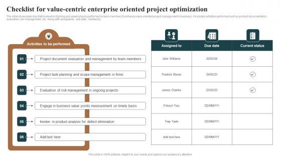 The slide showcases checklist involved in tracking and viewing tasks performed by team members to enhance value oriented project management in business . it includes activities performed such as product documentation , evaluation ,risk management , etc. Along with assigned to , due date , headed by . Showcasing this set of slides titled Checklist For Value Centric Enterprise Oriented Project Optimization Inspiration Pdf. The topics addressed in these templates are Team Members, Project Document Evaluation, Management. All the content presented in this PPT design is completely editable. Download it and make adjustments in color, background, font etc. as per your unique business setting. The slide showcases checklist involved in tracking and viewing tasks performed by team members to enhance value oriented project management in business . it includes activities performed such as product documentation , evaluation ,risk management , etc. Along with assigned to , due date , headed by .