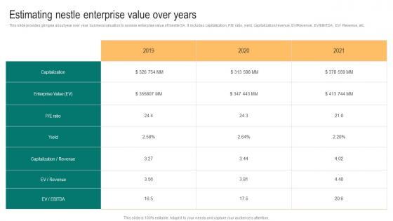 This slide provides glimpse about year over year business valuation to assess enterprise value of Nestle SA. It includes capitalization, P or E ratio, yield, capitalization or revenue, EV or Revenue, EV or EBITDA, EV or Revenue, etc. Find highly impressive Nestle Performance Management Report Estimating Nestle Enterprise Value Over Years Mockup PDF on Slidegeeks to deliver a meaningful presentation. You can save an ample amount of time using these presentation templates. No need to worry to prepare everything from scratch because Slidegeeks experts have already done a huge research and work for you. You need to download Nestle Performance Management Report Estimating Nestle Enterprise Value Over Years Mockup PDF for your upcoming presentation. All the presentation templates are 100 percent editable and you can change the color and personalize the content accordingly. Download now.
