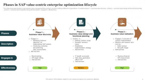 The slide showcases phases in sap business value management lifecycle thats assist in instilling software in organizations . it contains phase 1 business value discovery , phase 2 business value design and functional planning , phase 3 business value realization along with description , engages in , effectiveness . Pitch your topic with ease and precision using this Phases In Sap Value Centric Enterprise Optimization Lifecycle Brochure Pdf. This layout presents information on Implementing SAP Solution, Value Assessments, Develops Business. It is also available for immediate download and adjustment. So, changes can be made in the color, design, graphics or any other component to create a unique layout. The slide showcases phases in sap business value management lifecycle thats assist in instilling software in organizations . it contains phase 1 business value discovery , phase 2 business value design and functional planning , phase 3 business value realization along with description , engages in , effectiveness.