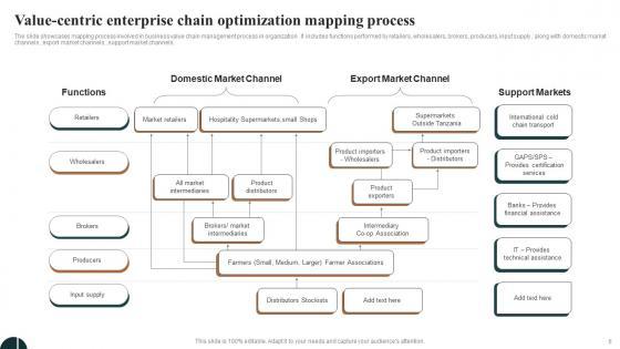 The slide showcases mapping process involved in business value chain management process in organization . It includes functions performed by retailers, wholesalers, brokers, producers, input supply , along with domestic market channels , export market channels , support market channels . Showcasing this set of slides titled Value Centric Enterprise Chain Optimization Mapping Process Diagrams Pdf. The topics addressed in these templates are Market Retailers, Domestic Market Channel, Export Market Channel. All the content presented in this PPT design is completely editable. Download it and make adjustments in color, background, font etc. as per your unique business setting. The slide showcases mapping process involved in business value chain management process in organization . It includes functions performed by retailers, wholesalers, brokers, producers, input supply , along with domestic market channels , export market channels , support market channels .