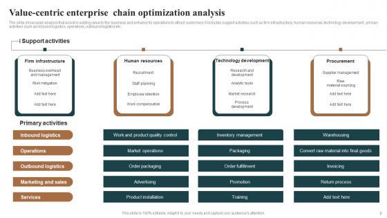 The slide showcases analysis that assist in adding value to the business and enhance its operations to attract customers. It includes support activities such as firm infrastructure, human resources, technology development , primary activities such as inbound logistics, operations, outbound logistics etc . Showcasing this set of slides titled Value Centric Enterprise Chain Optimization Analysis Background Pdf. The topics addressed in these templates are Firm Infrastructure, Human Resources, Technology Development. All the content presented in this PPT design is completely editable. Download it and make adjustments in color, background, font etc. as per your unique business setting. The slide showcases analysis that assist in adding value to the business and enhance its operations to attract customers. It includes support activities such as firm infrastructure, human resources, technology development , primary activities such as inbound logistics, operations, outbound logistics etc .