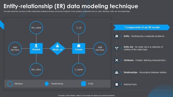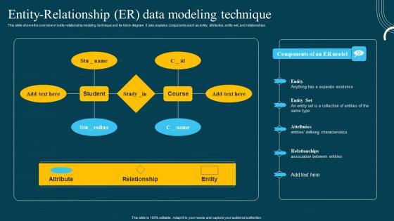 There are so many reasons you need a Entity Relationship Er Data Modeling Technique Data Modeling Techniques. The first reason is you can not spend time making everything from scratch, Thus, Slidegeeks has made presentation templates for you too. You can easily download these templates from our website easily. This slide offers a clear overview of entity relationship modeling, including its key components like entities, attributes, entity sets, and relationships. It also includes a block diagram to help visualize how these elements connect and work together effectively.